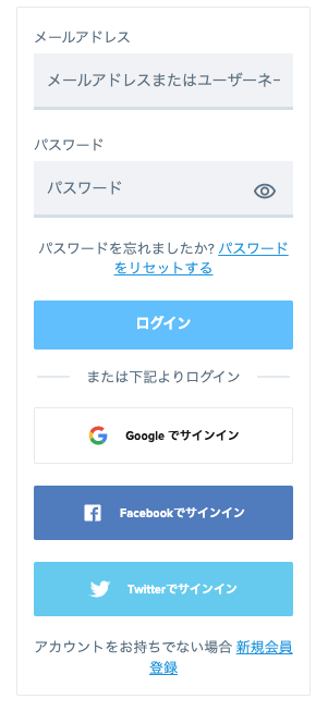 ログイン画面はトップ以外にも左サイド部分にも設けており、またオプションではSNSログイン(Google、Twitter、Facebook)での実装も可能です。