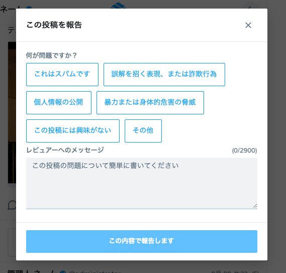 ポストされた投稿内容の通報・報告機能もこのようにTwitterライクで実装されております。
