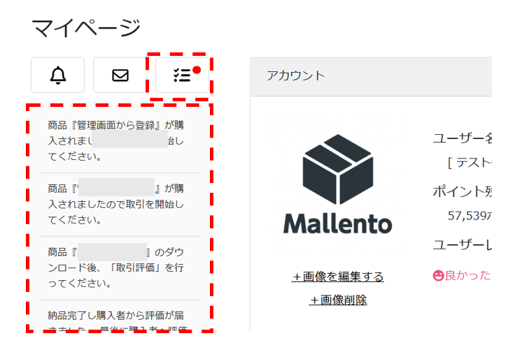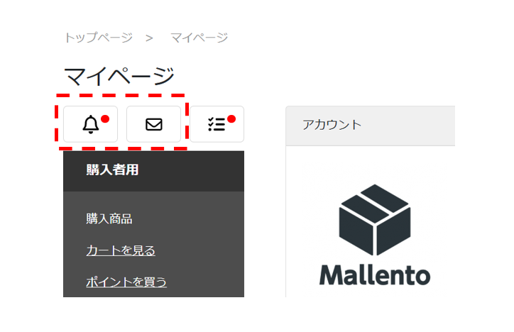 新着通知アイコン機能は、新着メッセージ、商品が購入された等のアクションがあった場合に、目立つアイコンを表示するようにカスタマイズしました。