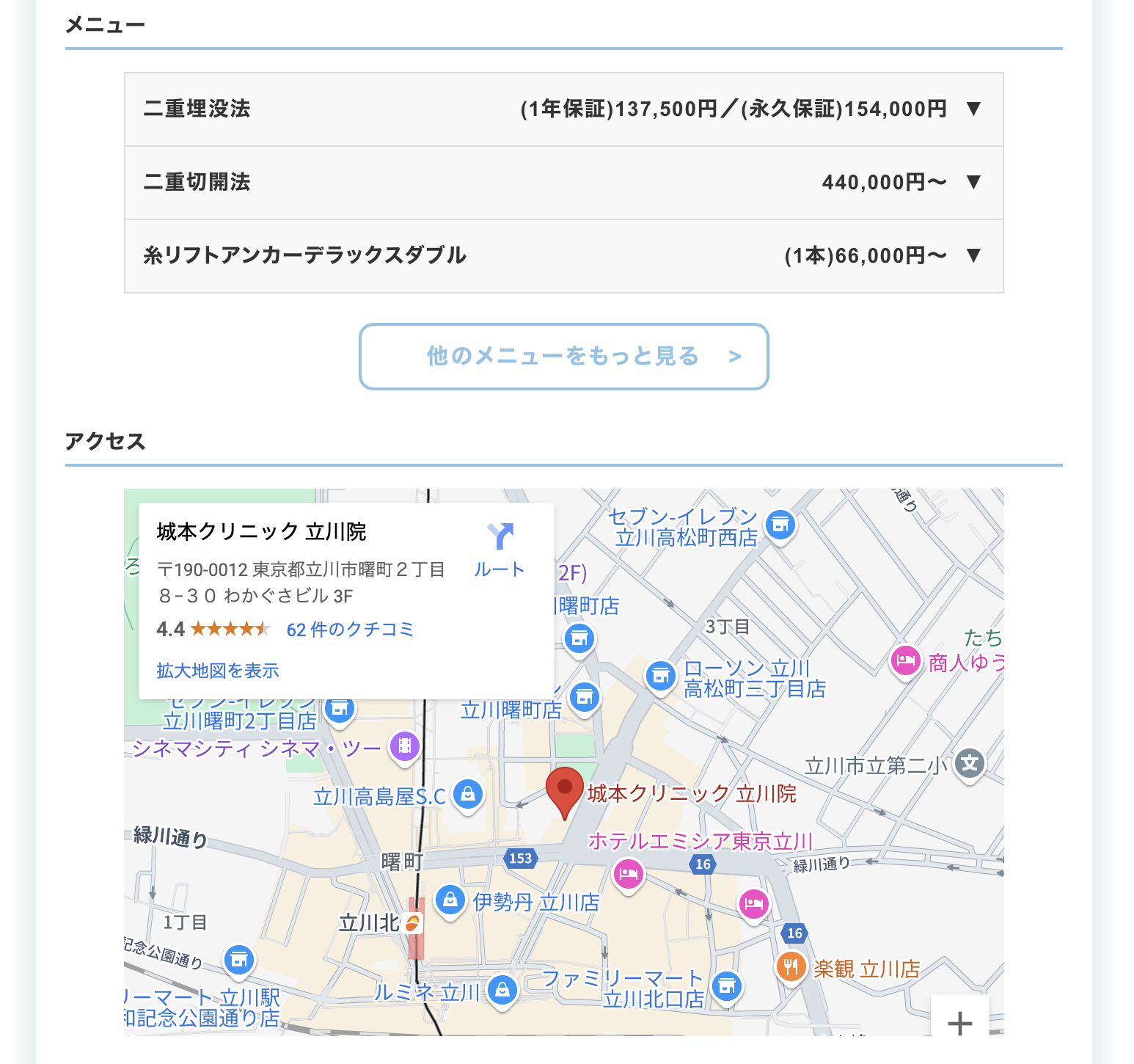 Googleマップ連携や最寄駅からの所要時間など、アクセス情報も明記。来院のイメージがしやすくなっています。
