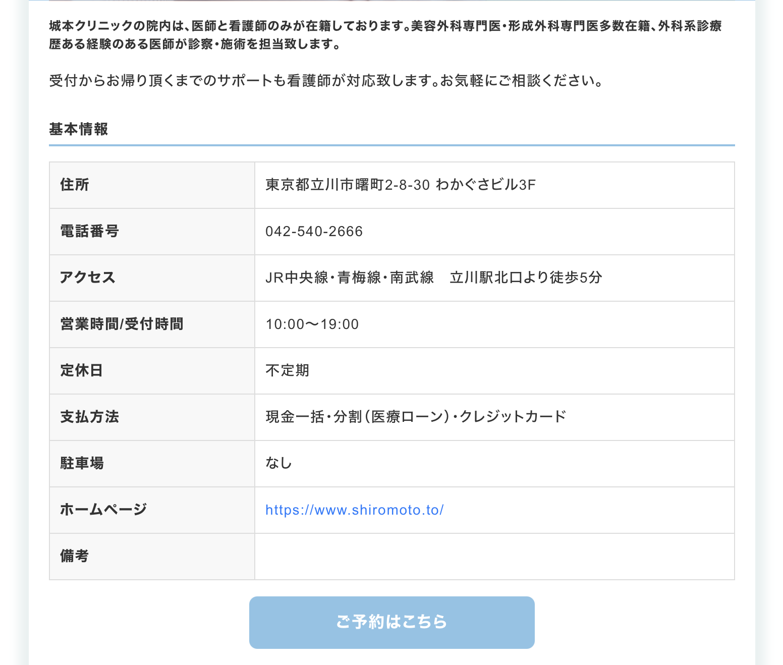 クリニック名、所在地、診療時間、休診日などの基本情報を見やすく整理して掲載しています。