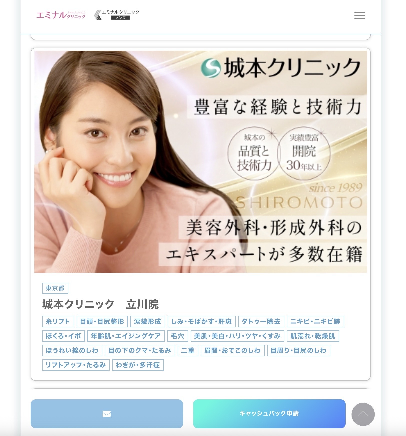 検索結果のリストでは、各クリニックのエリア・名称・対応施術メニューがコンパクトに表示され、直感的に比較・選択ができます。