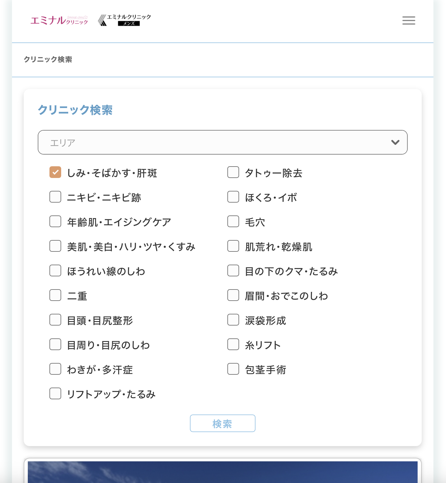 「クリニックを探す」ページでは、エリアや施術メニューごとに絞り込んだ検索が可能。複数条件を掛け合わせることで、希望に合ったクリニックをピンポイントで探せます。