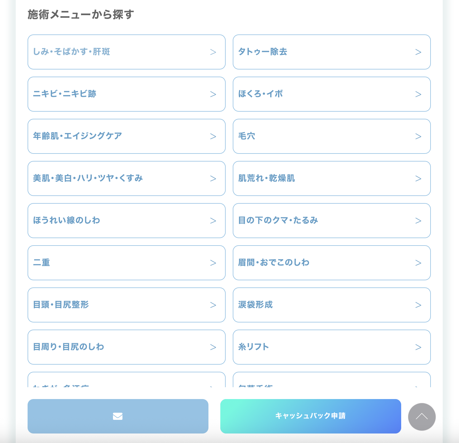 そのクリニックで対応している施術メニューを一覧表示。メニューごとに説明があるため、施術内容を比較・検討しやすくなっています。