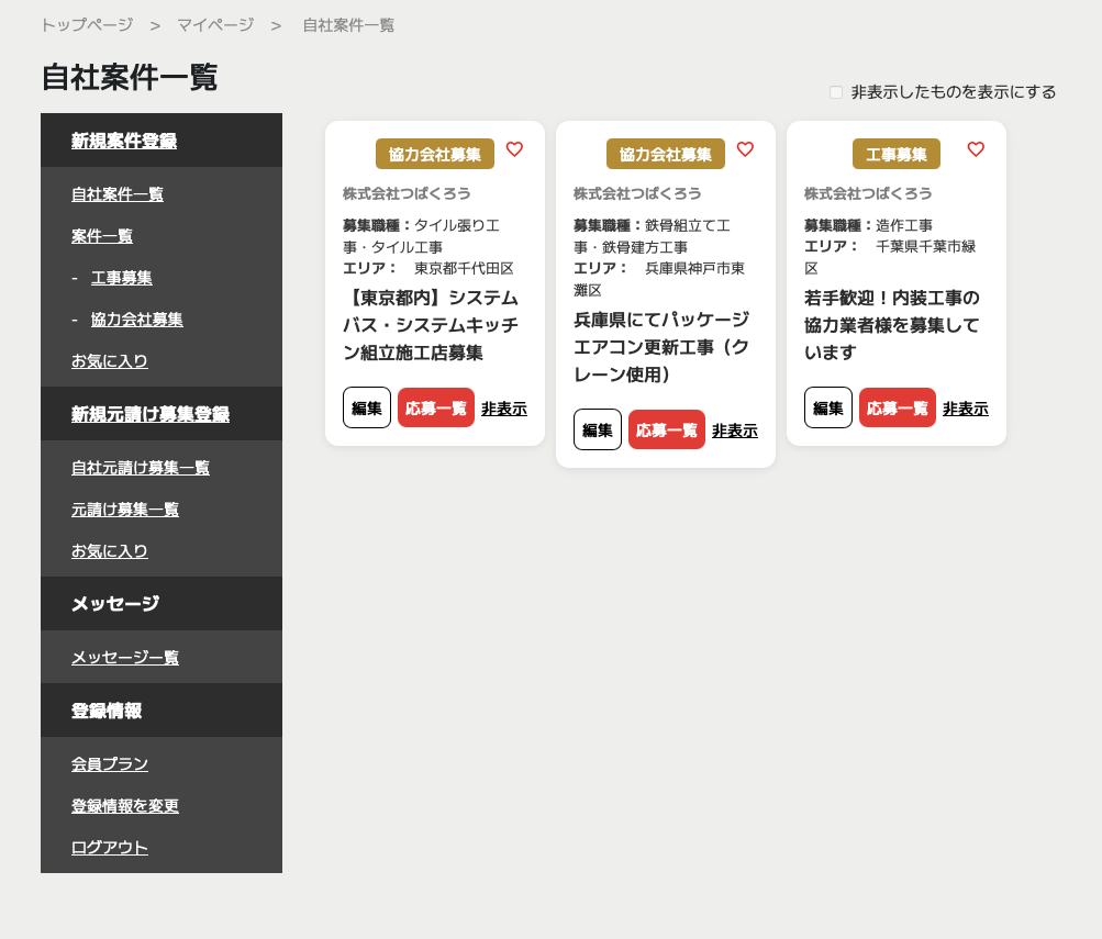 自社が出した案件は、マイページより管理ができ、