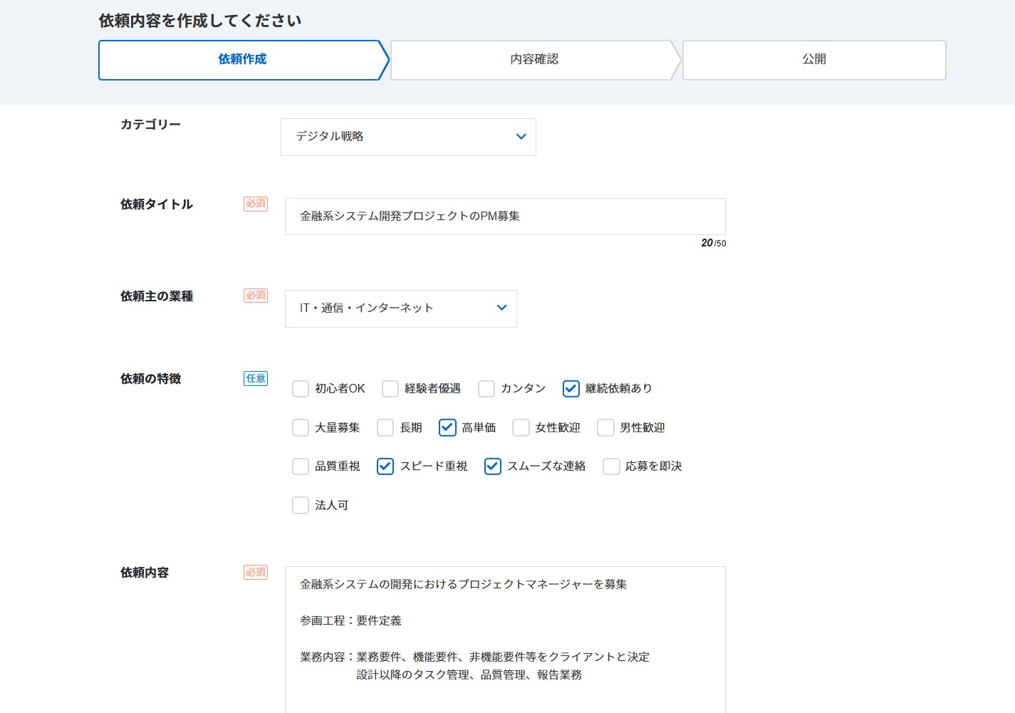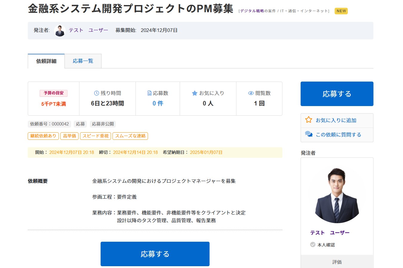 ・案件登録:発注者が案件を登録し、案件に必要なスキルや条件を指定できます。