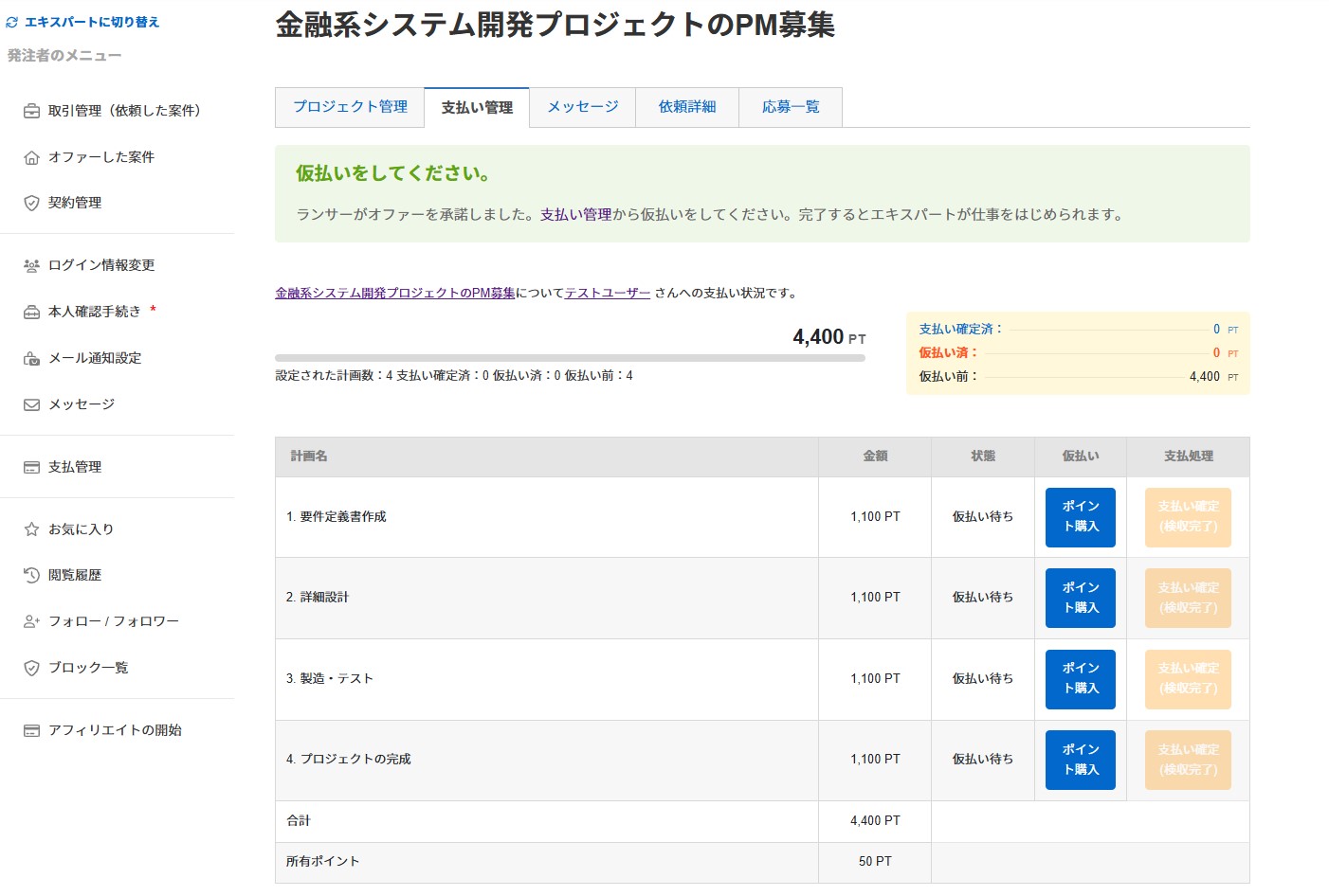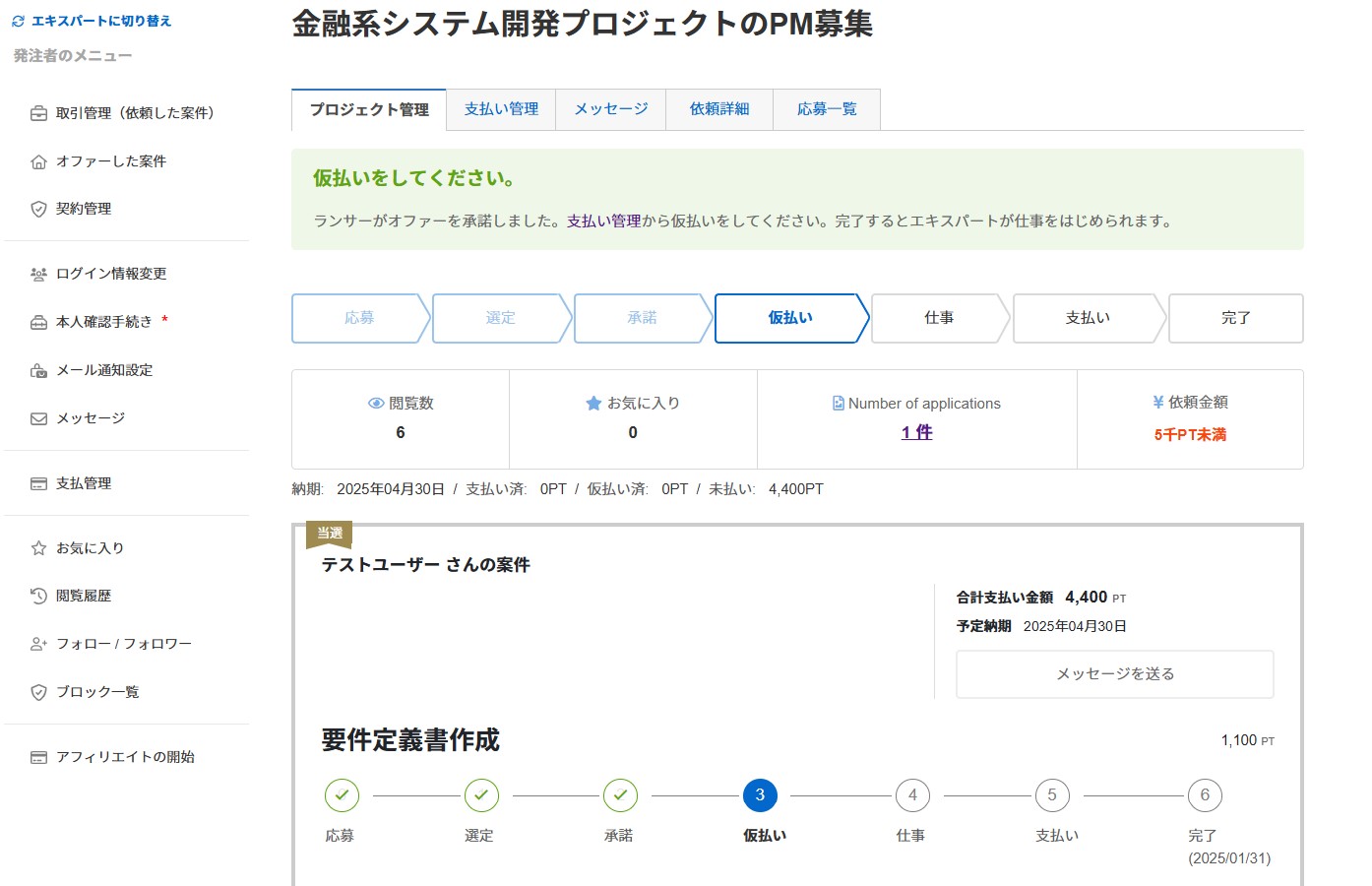 作業者が決定すると、案件詳細ページにプロジェクト管理メニュー(「プロジェクト管理」「支払い管理」)が解放されます。