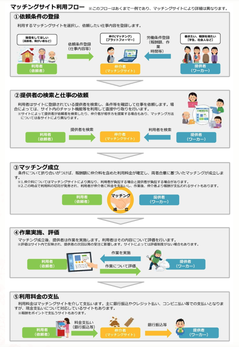 例えば、高齢者が庭の手入れを頼みたい、地域イベントの運営を手伝ってほしい、雪かきをしてほしい、のようにその地域の人口や気候、文化といった特有の課題への対応が必要になります。