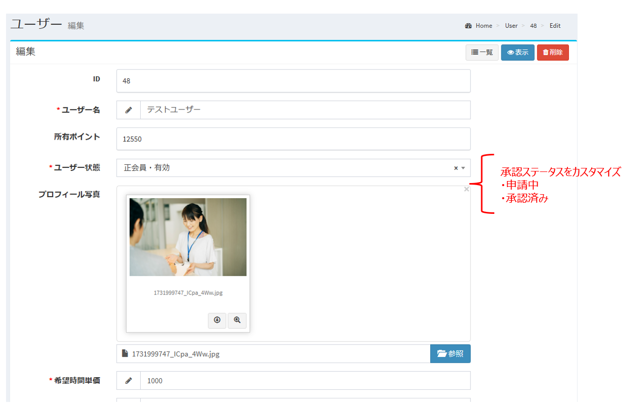 本人確認書類提出ユーザーのみ応募機能を解放(学生のみ)するよう、管理画面からユーザーの承認状況をステータス管理できるようにしました。