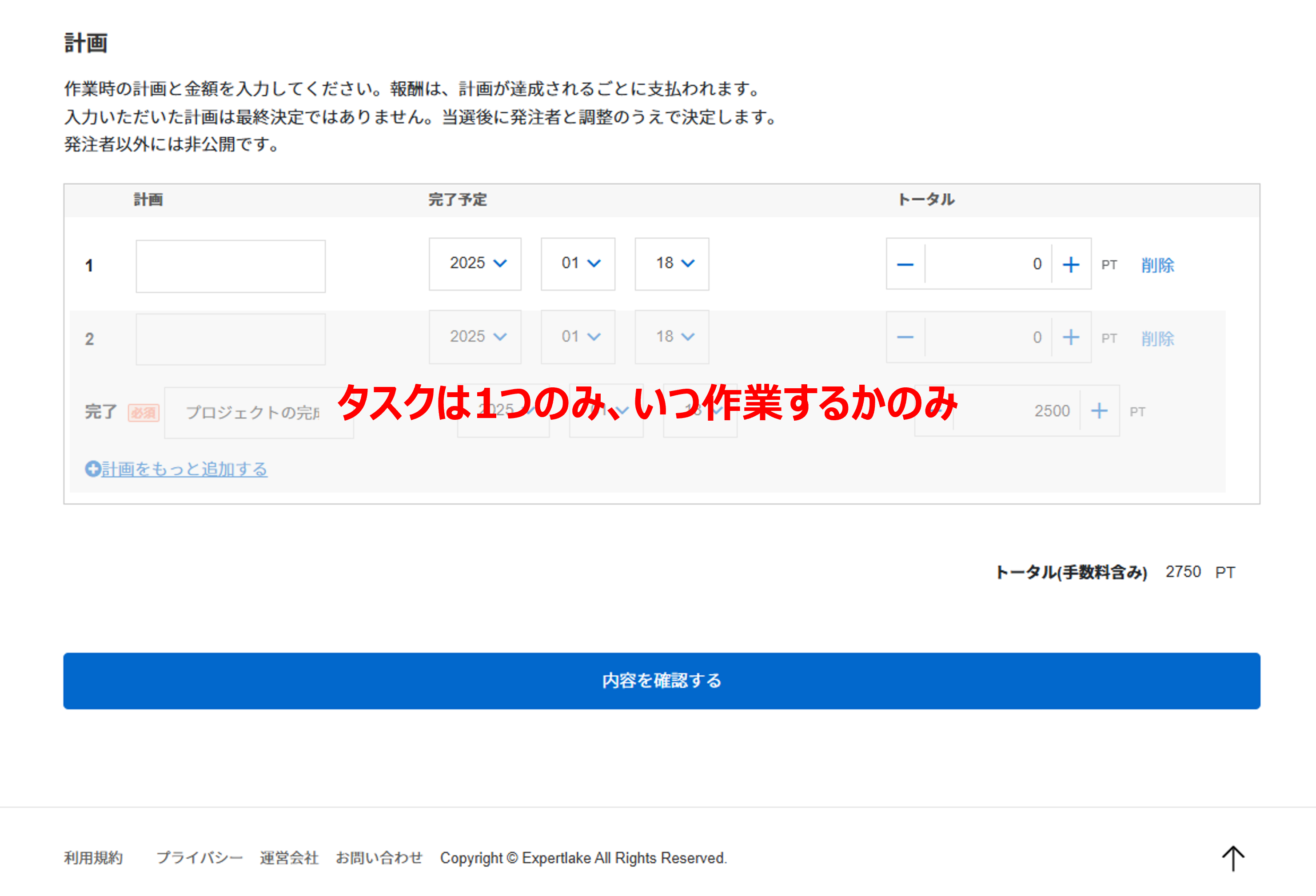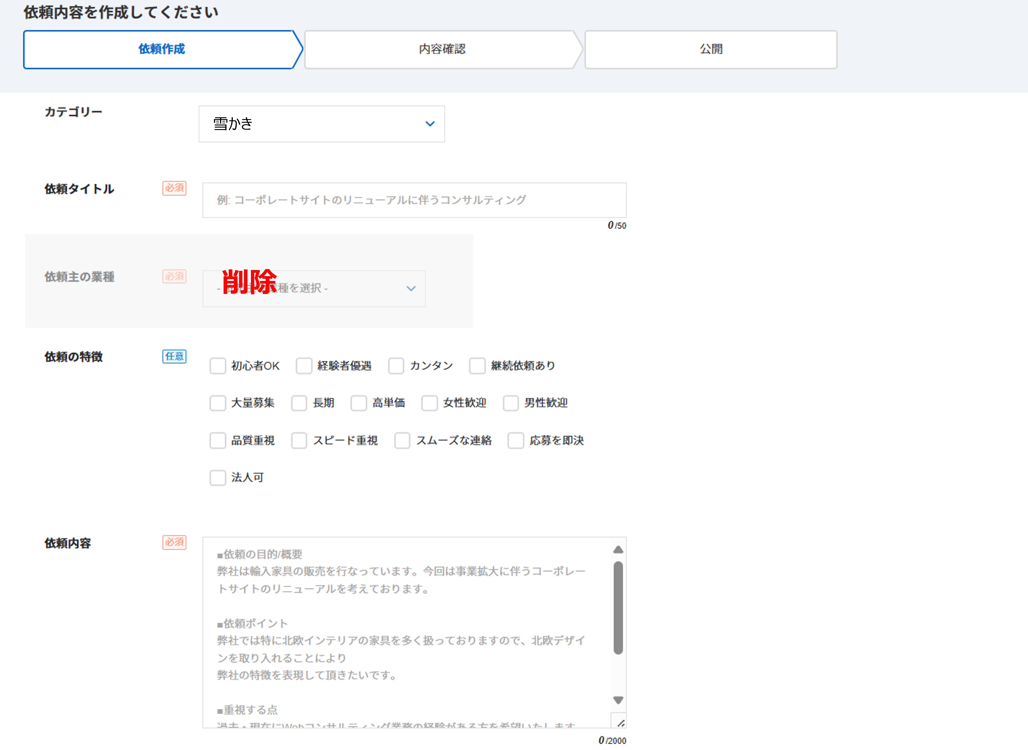 カテゴリーや特徴、依頼内容といった案件の詳細情報から、募集期限や予算目安を設定します。