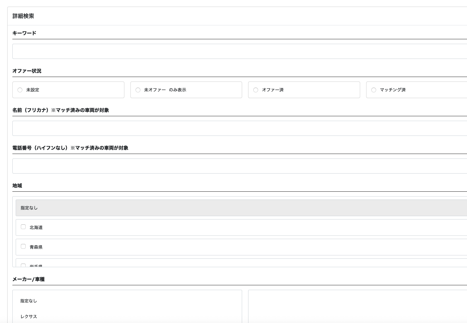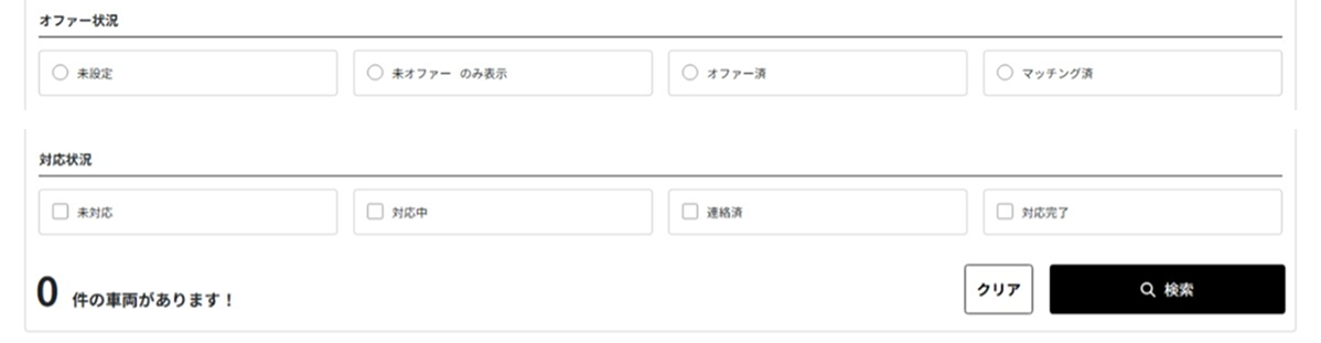 「未オファー」「オファー済」「査定依頼あり」「マッチング済」など、車両ごとの進捗状況(マッチングステータス)を条件に絞って検索できる機能を追加しました。