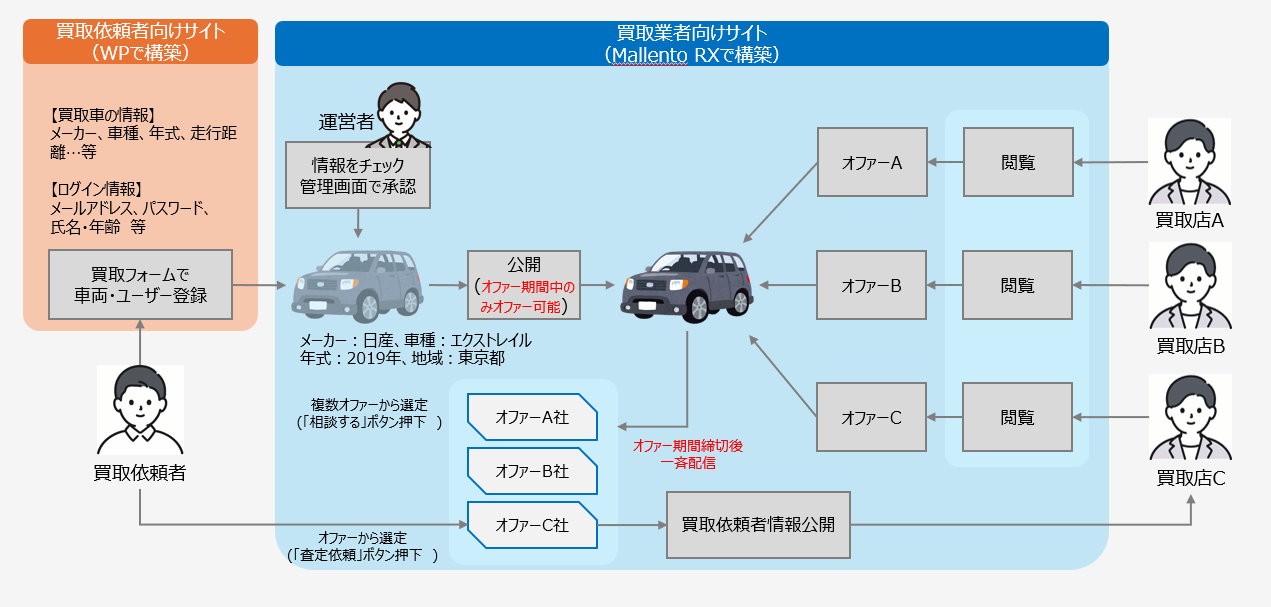 構築した「中古車買取マッチングサイト」は、中古車を売りたい個人ユーザー(買取依頼者)と、仕入れを行いたい中古車買取業者とをつなぐ、双方向型のオンラインマッチングサービスです。