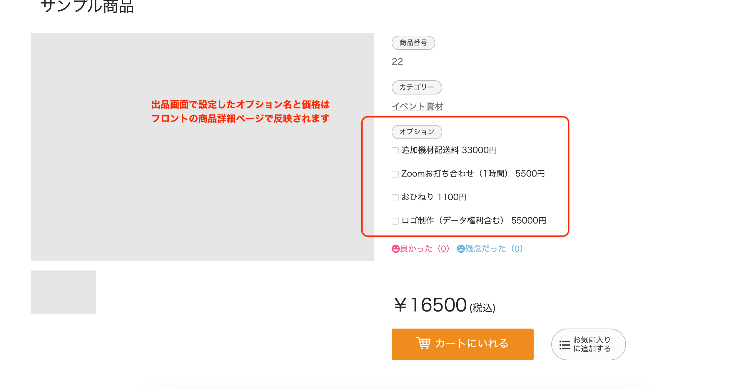 下記のようにユーザー側のフロントの商品詳細ページ画面で表示されます。