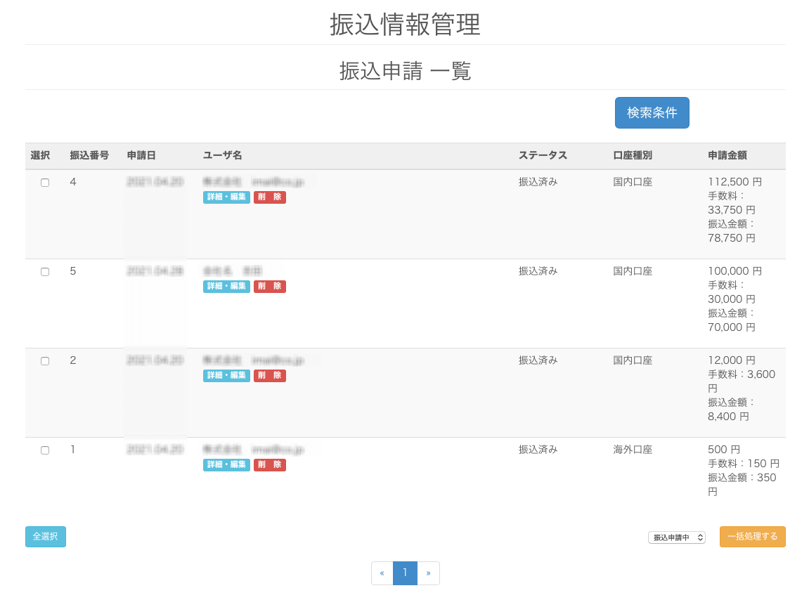 日付|申請金額|振込手数料|振込金額|状態 などが表示されます。