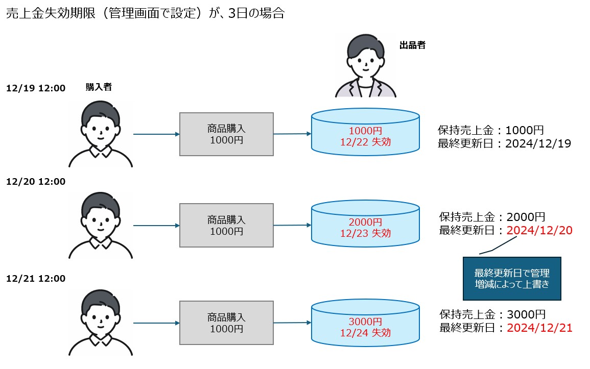 管理者が設定した期限日数を基に、売上金の変動がなければ失効処理を行う