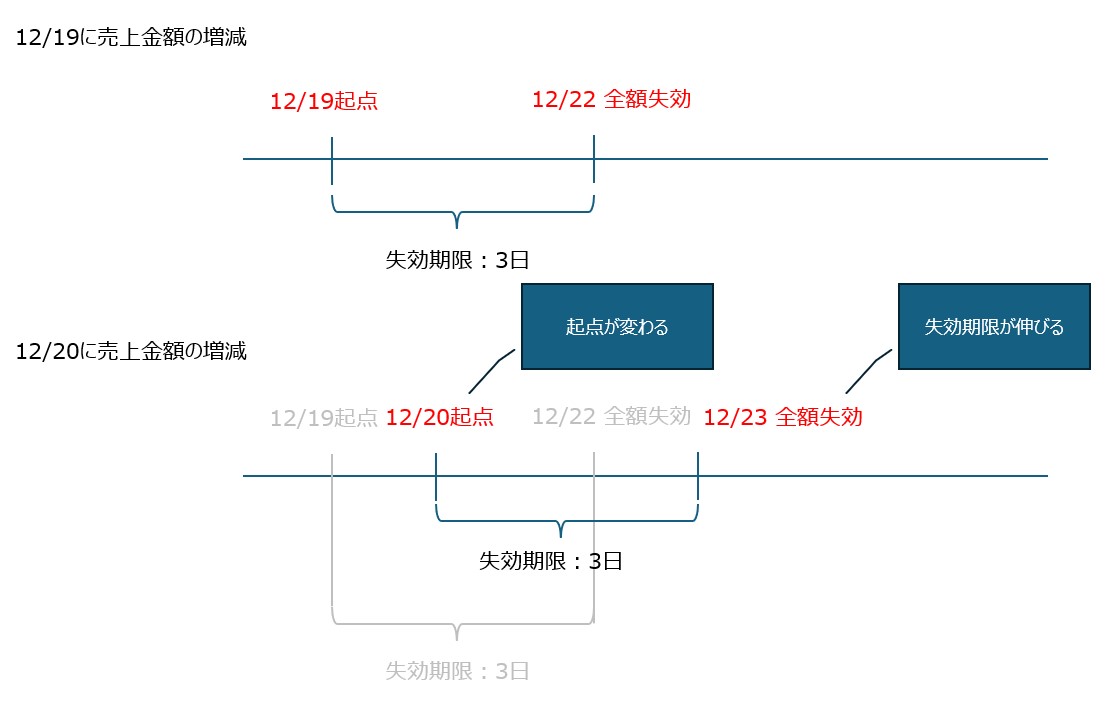 売上金額が変動した日を起点として、管理者が定めた日数以上金額の変動がない場合に全額失効する仕様です。