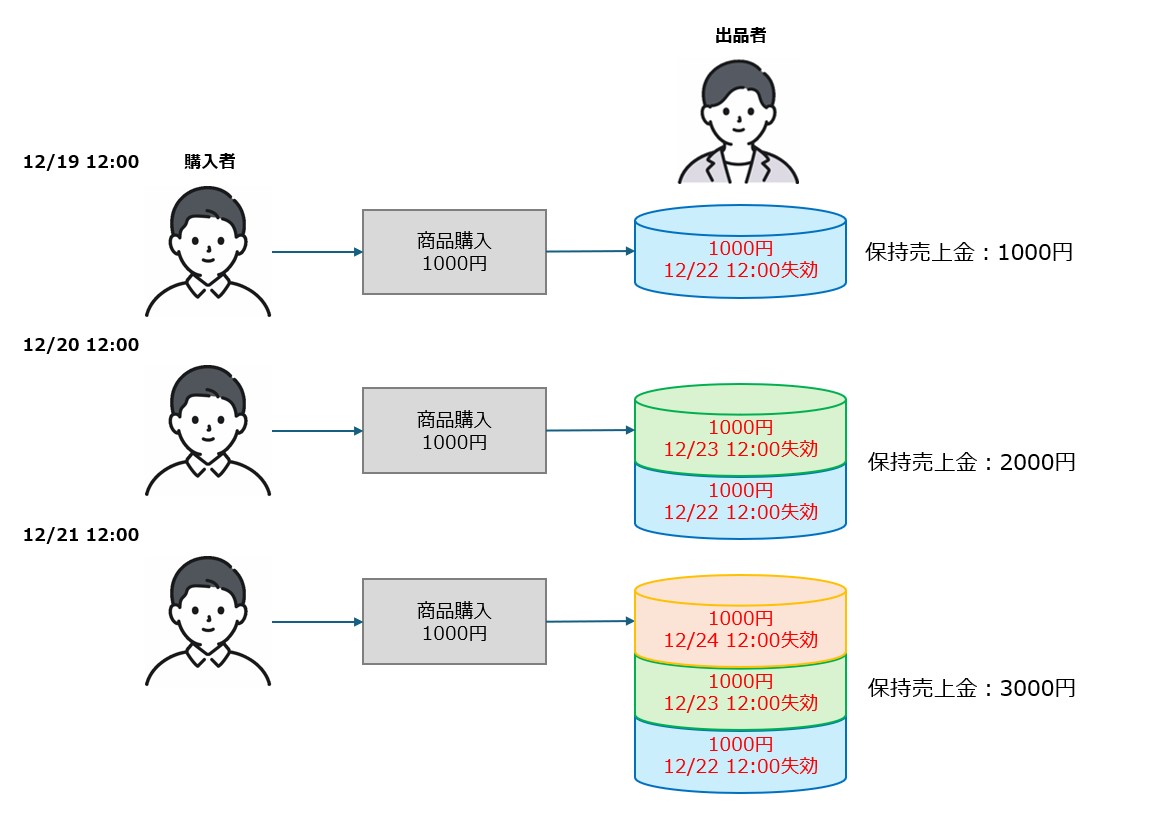 ①ユーザーが売上金を獲得するたびに、売上日時と失効期限を記録