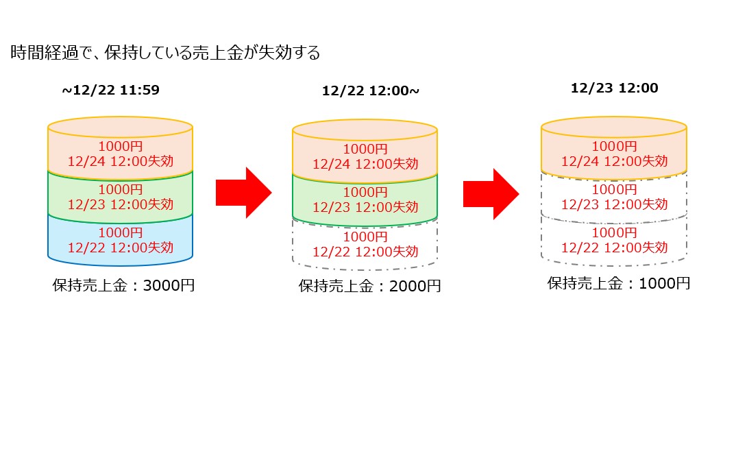売上金情報には「獲得日時」や「失効期限日」を含め、各売上金額に対して、失効期限が過ぎていないかをチェックし、期限が過ぎていればその金額を失効します。