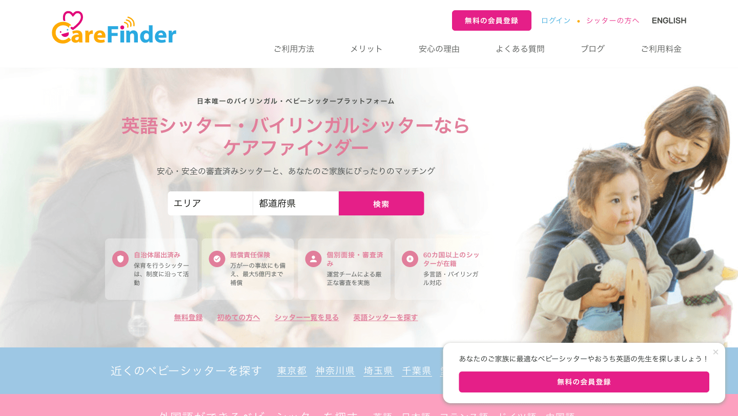 CareFinderは、ケアファインダー株式会社が運営するマッチングサービスです。英語・日本語対応のシッターを探しやすく、東京・横浜・大阪・京都などの地域別料金目安が出ているため、費用感を把握しながら比較しやすいのが特徴です。全国と断定するよりも、都市部を中心に利用イメージを持ちやすいサービスとして捉えるとわかりやすいです。英語対応まで視野に入れて探したい家庭には、他サービスと違う選び方ができます。