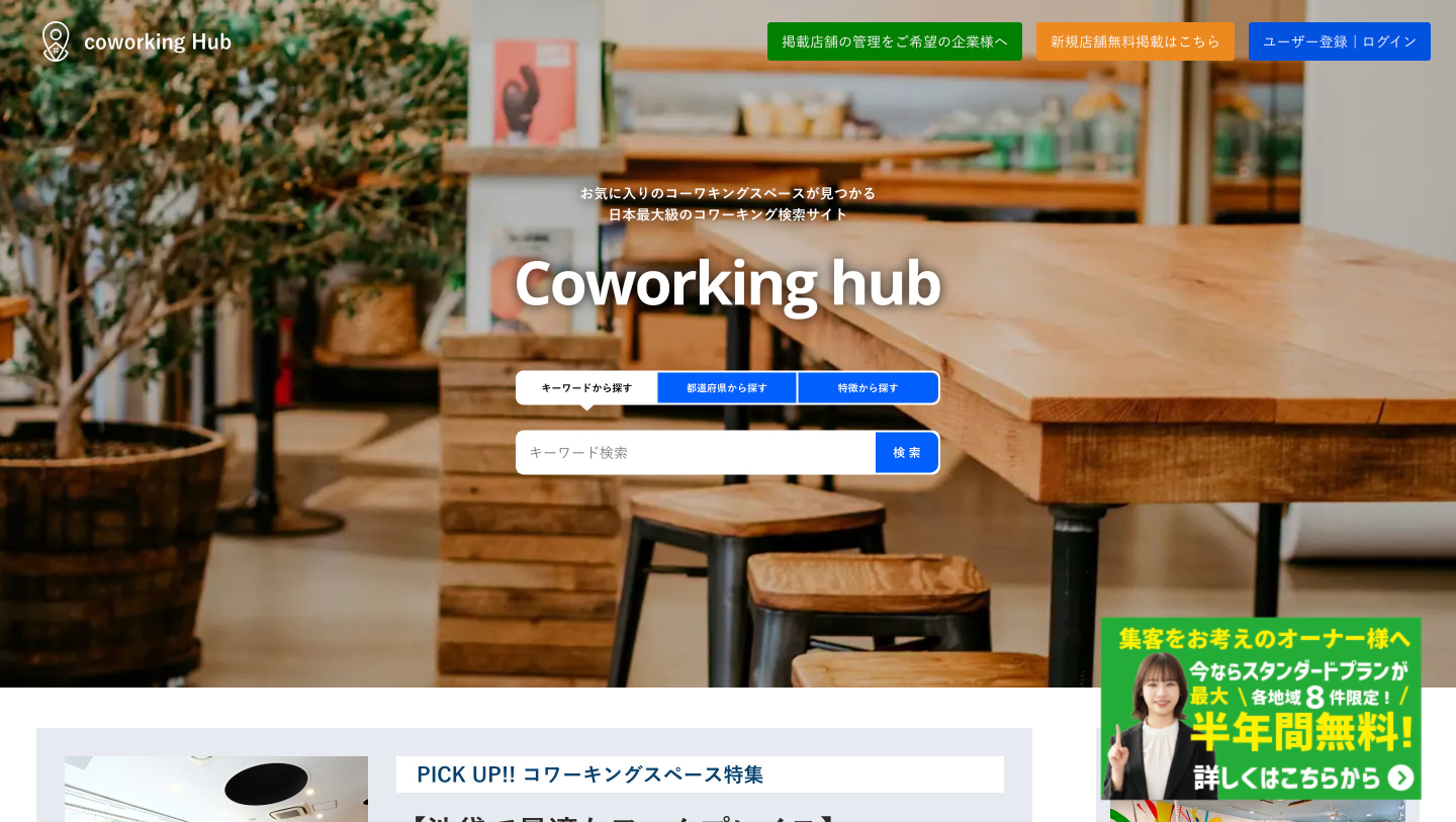 一部は共通で使えますが、コワーキング寄りで探したいなら、コワーキングハブのように特徴や設備条件から探しやすいサイトも併用したほうが比較しやすくなります。